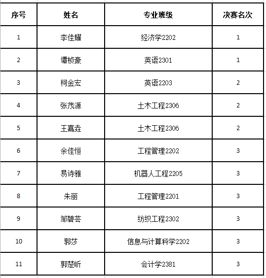 根据《“理解当代中国”湖南工程学院大学生外语能力大赛通知》精神,综合能力组经复赛、决赛两个环节,拟定李佳耀、谭桢豪获一等奖,柯金宏、张茂源、王嘉垚获二等奖,余佳恒、易诗雅、朱丽、邹碧芸、郭莎、郭楚昕获三等奖。现将结果予以公示。