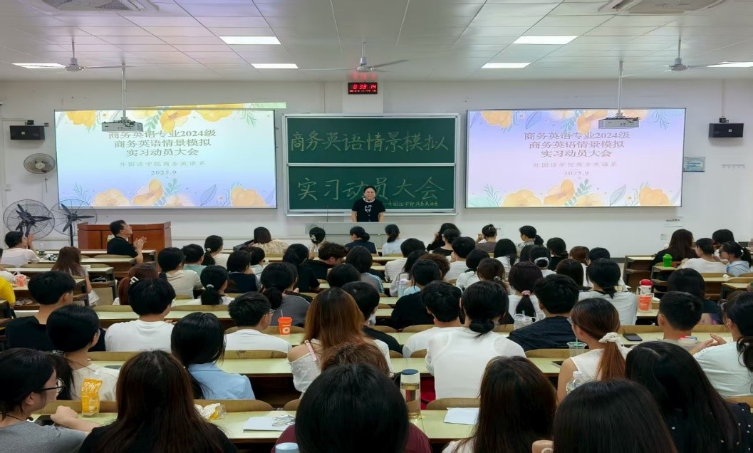 为进一步深化课堂教学内容,全面提升学生的语言综合运用能力、跨文化沟通能力、商务实践能力与团队协作能力,cctv13直播间在线观看商务英语系于2025年9月8日上午在D102教室隆重举行2024级商务英语情景模拟实习动员大会。商务英语系主任何梦丽及全体指导老师出席大会,商务英语24级全体同学参加。