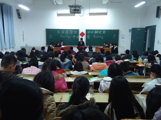 2013年11月19日晚七点,我院辩论赛半决赛在教学楼C座506隆重举行。担任此次辩论赛的主席有管幸瑶、谢城两位同学。同时,还邀请了各学院往届优秀辩手担任评委,各学院学习部部长担任嘉宾。