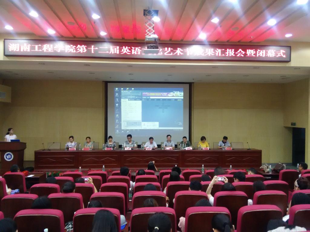 本届英语文化艺术节于4月28日开幕,持续一个多月,举办了英语演讲比赛、英文PPT大赛、经典英文影视配音大赛、中外欢乐知识赛、英文模拟应聘大赛共五项赛事。闭幕式上,主持人蒋莉介绍了英语文化艺术节各项赛事的开展情况,并邀请各项赛事的冠军队伍向领导和同学们进行了汇报展示。