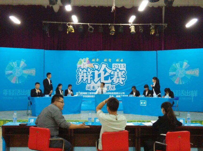 2015年4月28日晚七点,湖南工程学院第十二届辩论赛第三场复赛在明德二食堂三楼的活动中心举行,cctv13直播间在线观看和化学化工学院代表队参与了此次辩论。比赛特邀湘潭电视台法制频道制片人李军老师,湘潭电台交通频道主播高兴老师,湘潭市口才协会副会长彭英老师担任评委。