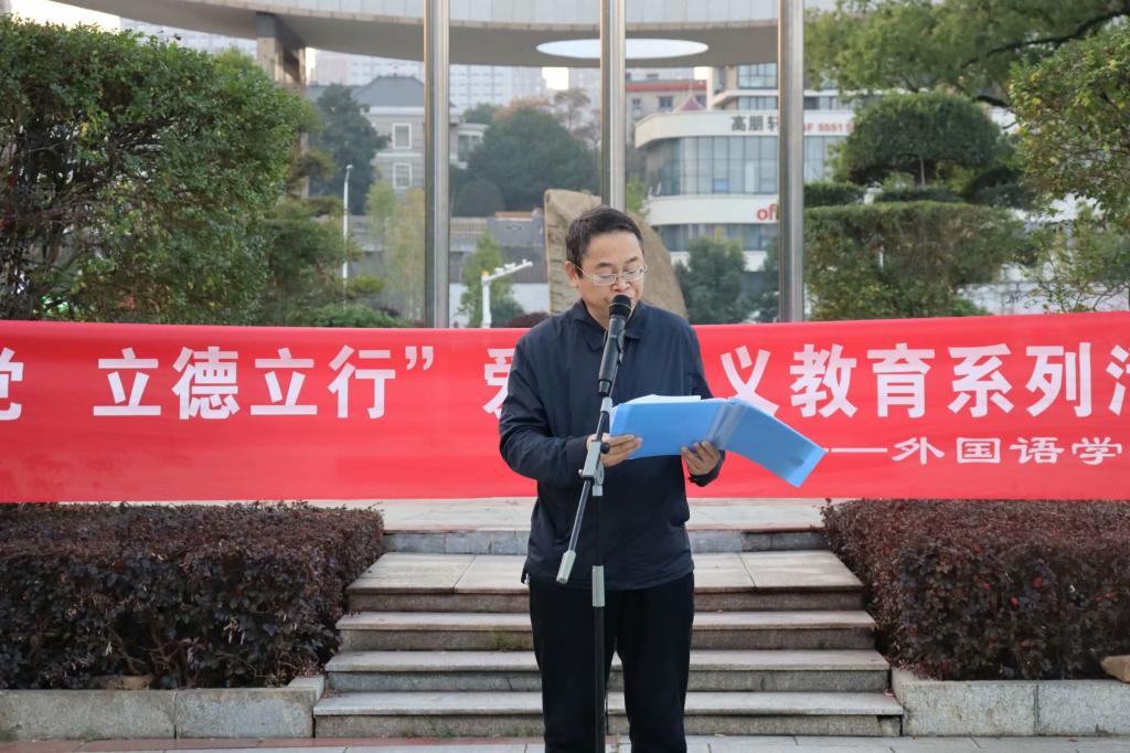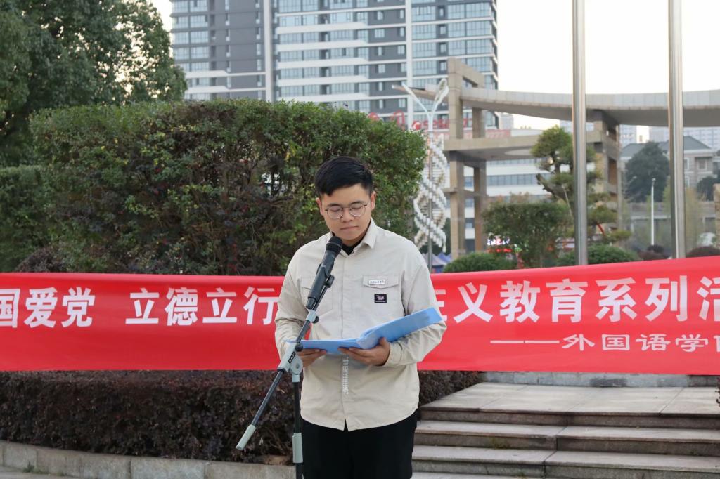 随后,商务英语1904班刘世龙作为学生代表在国旗下发表了题为“爱党爱国,立德立行”的讲话。他的发言让同学们深刻认识到中国梦的本质是国家富强、民族振兴、人民幸福,中国梦还是一股激发全体人民爱党爱国爱社会主义的巨大热情,凝聚奋进新时代、实现民族复兴的磅礴伟力。紧接着杨永和院长致辞,他指出,当前国际形势正在发生深刻复杂变化,作为当代青年大学生更加有责任、有义务投身捍卫国家利益和社会主义建设的事业,勤奋学习、理性爱国,为建设中国特色社会主义、实现中华民族伟大复兴而努力奋斗!接下来,学院辅导员老师们对近期学院工作作了总结,期望外院同学能够在未来的学习与生活中有所进步。党总支副书记罗望阳也对同学们付诸希冀,寄语同学们要时刻准备着提升自我,时刻为美好的未来而拼搏。同时也强调同学们更应该勇担时代重任,树立自己的目标、坚定自己的理想,掌舵青春,扬帆远航,为建设祖国而不懈奋斗。