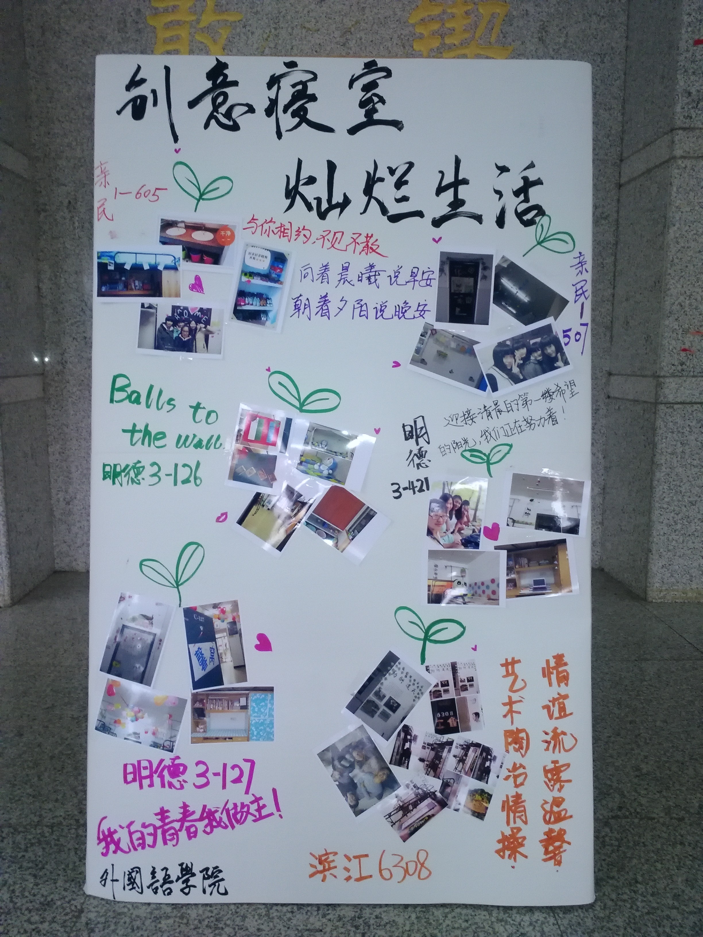 为美化寝室环境,营造良好的寝室文化氛围,增强寝室凝聚力,由我院生活部和心理部主办的寝室文化大赛于2014年11月11日正式拉开序幕。本次寝室文化大赛以“和、闲、雅”之“我寝,我爱”为主题。