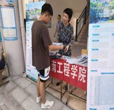 两位老师赴株洲县五中、醴陵二中、祁东一中、衡东一中、湘南实验中学、常宁一中等六所生源中学开展宣传招生工作。招生老师到达各中学宣传点后布置会场,找准有利位置张贴横幅,树立易拉宝,核对招生简章,做好前期准备。待学生和家长进入宣传现场后,两位老师主动宣传、耐心解答、诚挚建议,重点向学生及家长介绍了我校概况、特色专业、师资力量、校企合作和毕业生就业等情况,共分发招生宣传资料700余份,力求让学生及家长全方位了解我校,选择报考我校。对于有意向报考我院相关专业的学生,两位老师与现场学生还互加了微信,为考生提供后续线上交流和咨询帮助,使之成为有效生源。