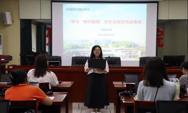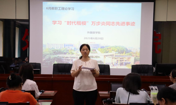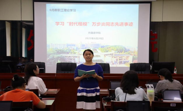 620下午外国语学F309召开教职工政治理论学习会议本次学习主题为学习“时代楷模”万步炎同志先进事迹,会议由学院党总支书记陈亚琼主持,cctv13直播间在线观看全体教职工参加。