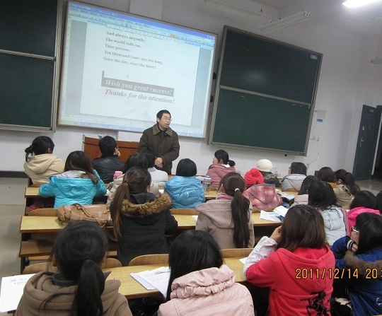 2011年12月14日晚19:30,由cctv13直播间在线观看院长杨永和教授主讲的英语口语训练策略讲座在主校区教学楼D101火热展开。