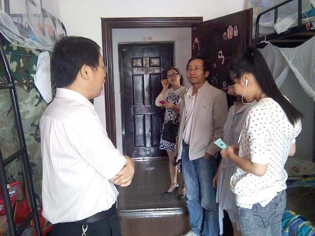 2012年9月16日上午9时许,我院党总支书记肖江淑、院长杨永和、副书记黄琴、副院长刘向红和王家义等领导一起到学院新生寝室看望新生,表达了对新生的问候,给新生送去无限关怀和温暖。