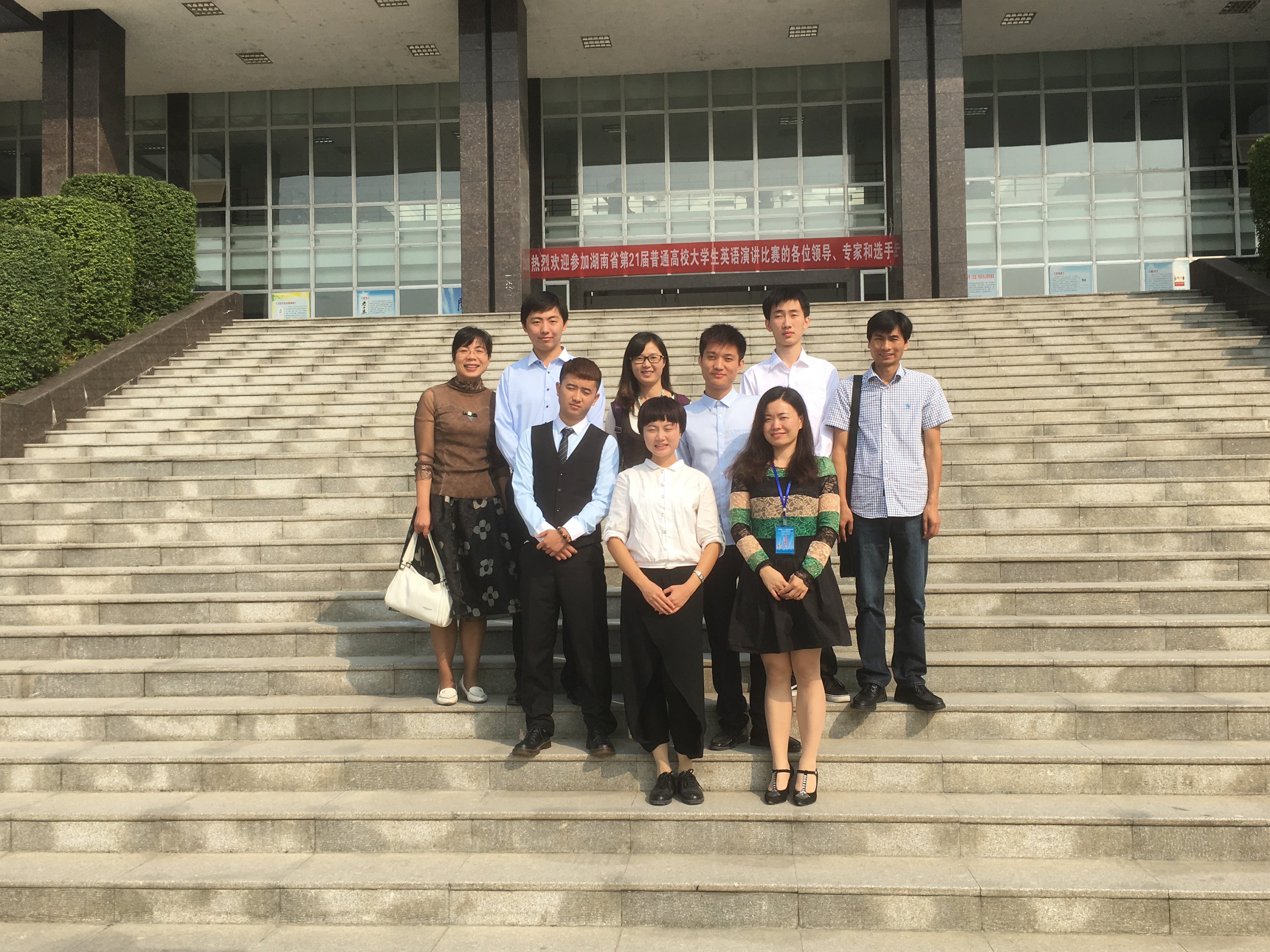 湖南省第二十一届普通高等学校大学生英语演讲比赛暨第六届“外研社杯”全国英语演讲比赛复赛(湖南赛区)于10月24日至25日在怀化学院举行。我校派出以王家义为领队,陈锋、刘青、毛帅梅为指导教师,以及6名选手组成的本科一组(二本)和本科二组(三本)代表队参加比赛。副校长李军林和应用技术学院院长李光中、总支副书记徐粤宇等亲临现场,为选手加油助威。经过两天紧张激烈的角逐,我校选手不畏强敌,稳定发挥,获得了竞赛二组个人二等奖(邓宇轩,英语1381)和竞赛一组个人三等奖(周胤,土木1301)。