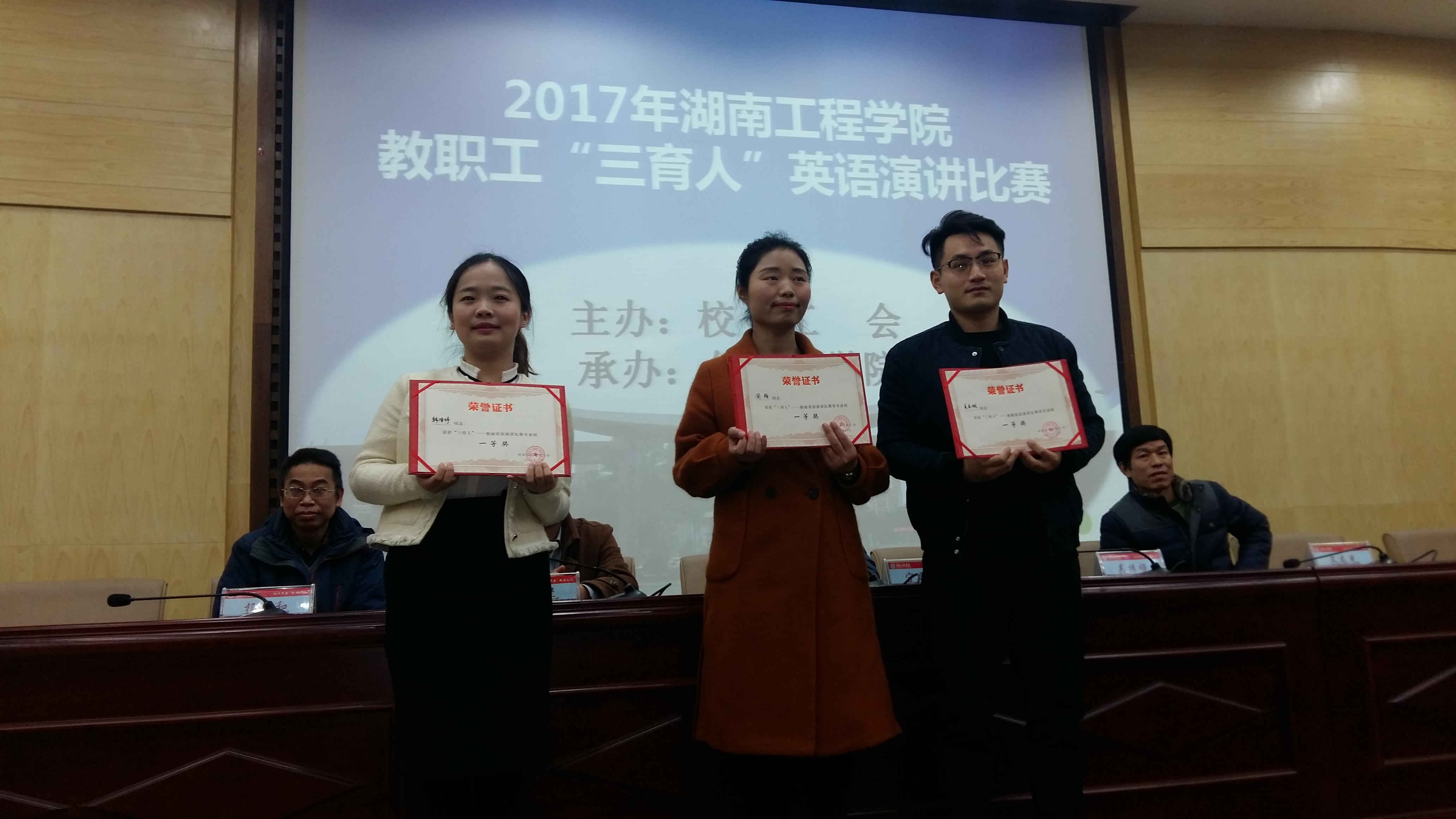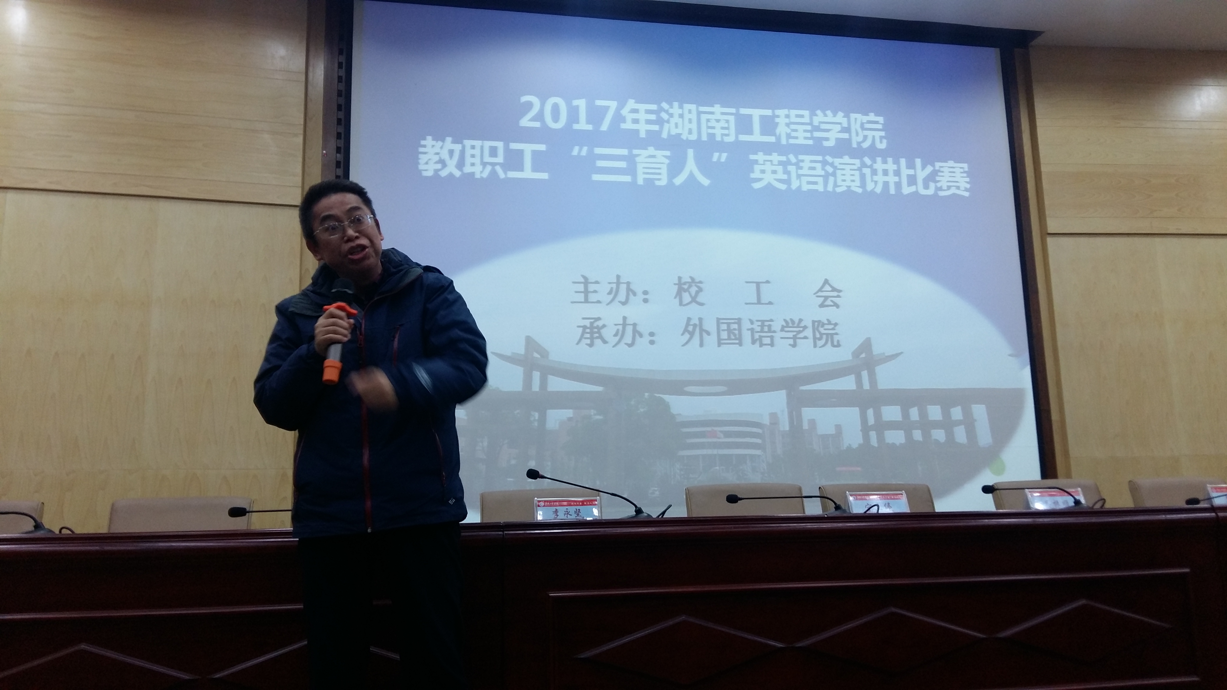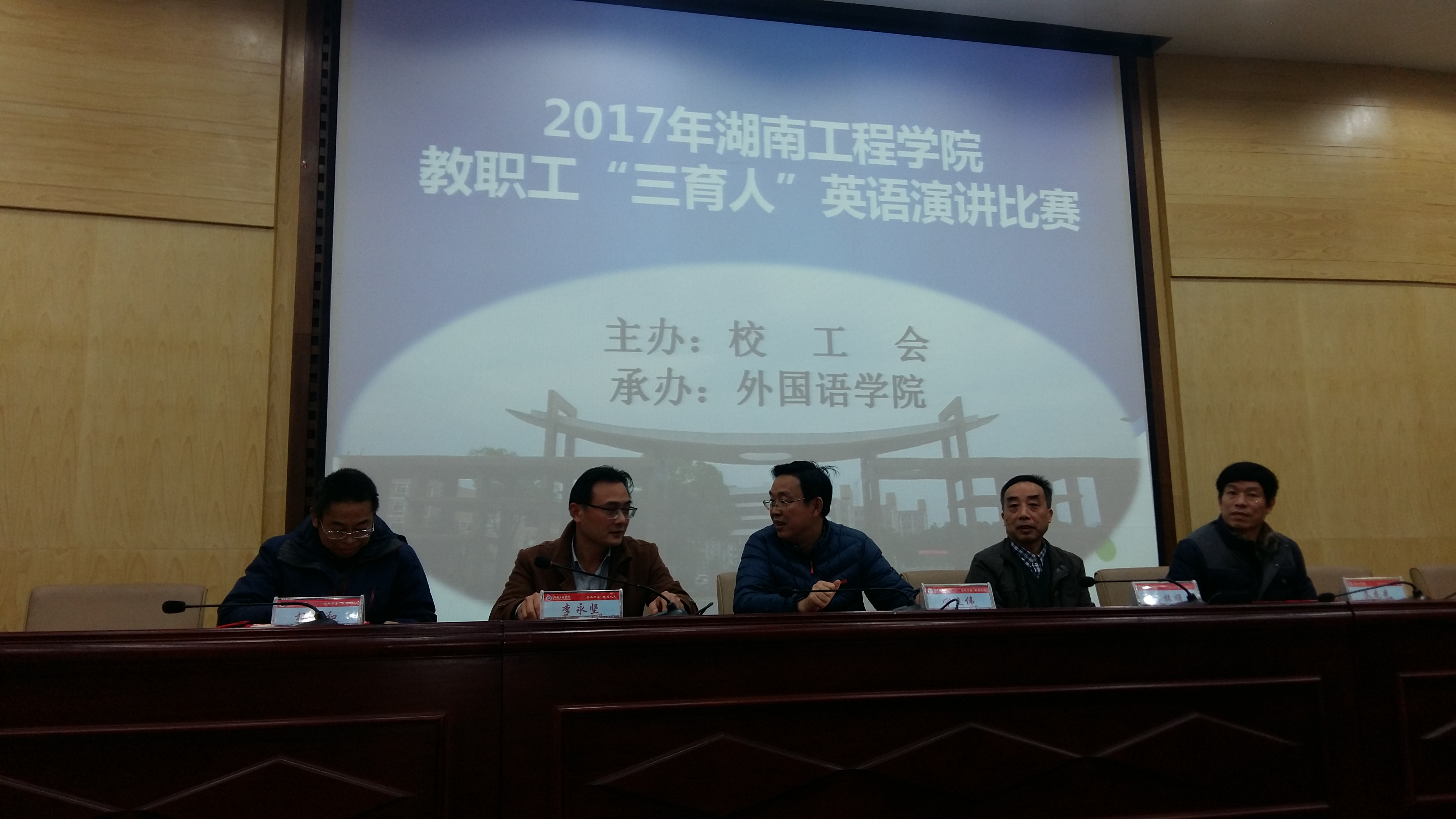 为加强学校教职工的师德师风建设,提高教职工业务素质与英语水平,我校于12月5日晚在二报告厅举办了2017年湖南工程学院教职工“三育人”英语演讲比赛。本次比赛由校工会联合人事处、教务处共同举办,cctv13直播间在线观看承办,杨永和、罗胜杰、刘向红、曹丽英、朱洁、外教Tony和Mark担任评委,李增强和陈锋担任主持,近200余名师生现场观摩。