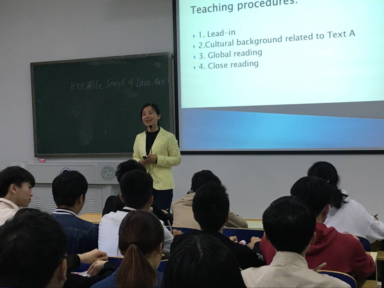 为讲授内容,为便于学生理解,她从学生感兴趣的西方饮食文化切入,成功地吸引了学生的关注,大家热情地参与到全球化给我们的生活带来了何种影响的大讨论中。接下来,结合课文,进一步了解达沃斯人以及达沃斯人所具有的特性。