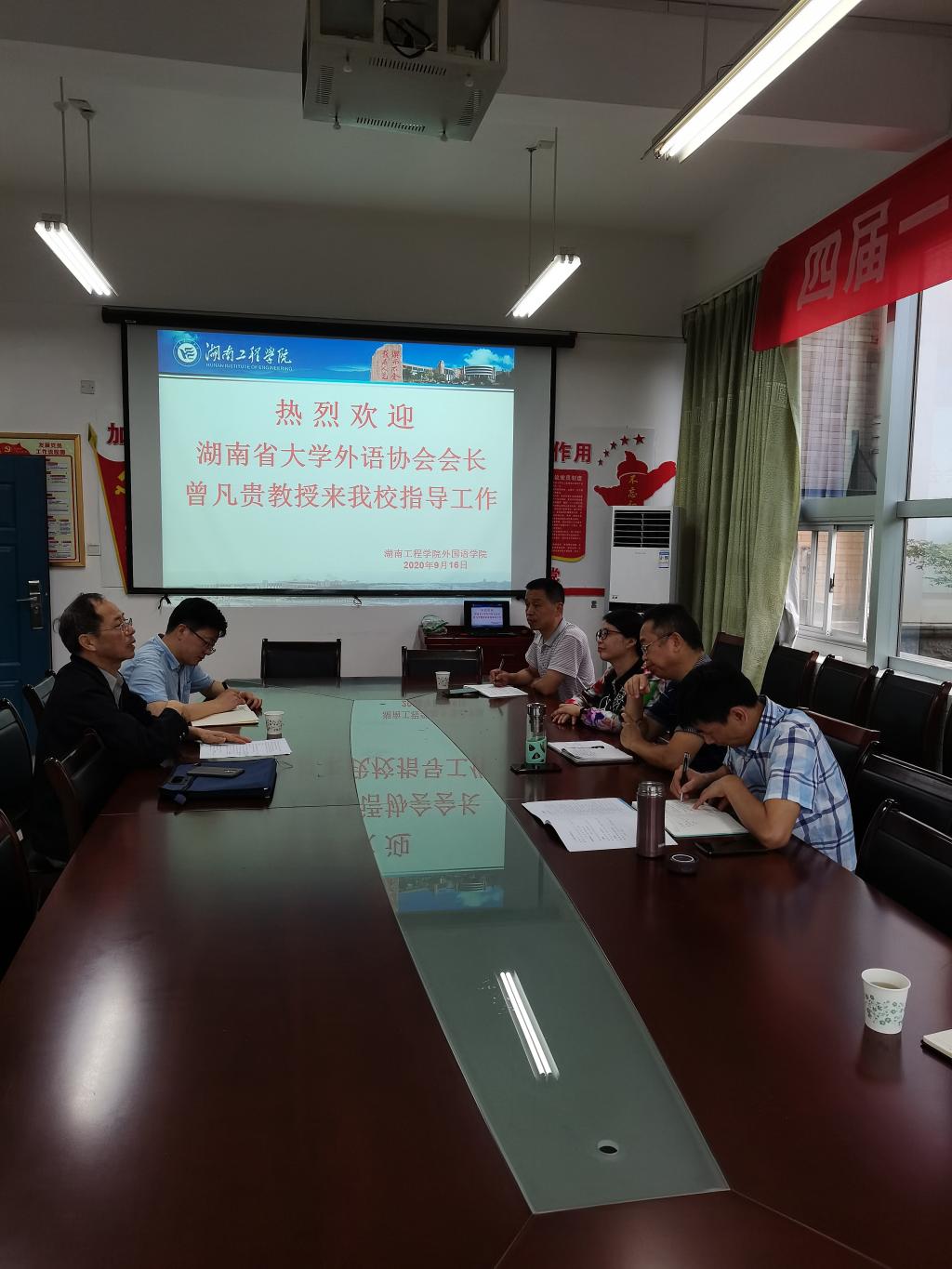 2020年湖南省大学生英语演讲比赛将于10月下旬在我校举行,为确保此次大赛的圆满举办,湖南省大学外语专业委员会会长曾凡贵教授于2020年9月16日上午专程来到我校,就英语演讲比赛作主旨报告,并对省级学科竞赛相关工作进行指导。我校副校长李军林教授与曾凡贵教授进行了亲切友好的会谈,创新创业学院院长刘洞波教授和cctv13直播间在线观看领导班子成员参与会议。