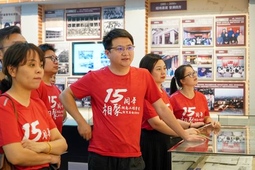 随后,校友们一行来到主校区校史馆,得知讲解员志愿者恰好是商务英语20级的学妹,学长学姐们倍感亲切。校史馆内,校友们围绕在刻画我校发展历程的面壁前,看着校歌歌词,校友们情不自禁,集体不约而同地大声合唱:“相聚湘江之滨,踏着伟人足迹,扬起青春的风帆......”岁月有痕爱无痕,即使毕业多年,一首校歌依然能瞬间把大家拉回到从前。