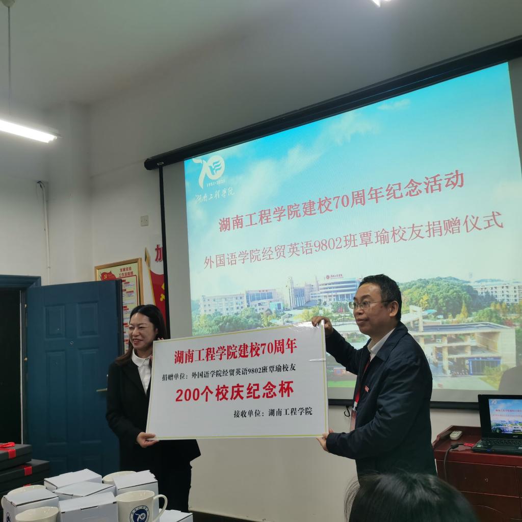 仪式上,经贸英语9301班文丰代表班级捐赠54200元;经贸英语0312班许展和刘倩雯代表杨杰校友捐赠50000元;经贸英语9401班洪庆华和杨东代表彭中云校友捐赠价值18800元的丝巾礼盒100份;杨永和院长代表经贸英语9802班覃瑜校友送上200份校庆纪念杯。陈亚琼代表学院再次表示感谢:校友们的捐赠,都是心的表露,情的凝聚,饱含的都是湖工学子对母校浓浓的爱。
