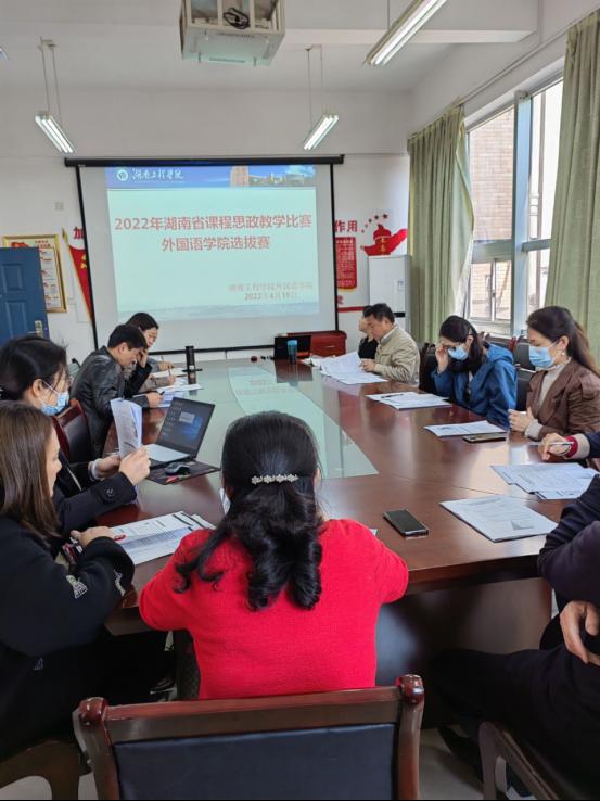4月19日下午, 2022年湖南省课程思政教学比赛cctv13直播间在线观看选拔赛在F119举行。各参赛团队负责人和成员参加,院学术委员会委员担任比赛评委,院教学督导、青年教师等观摩。