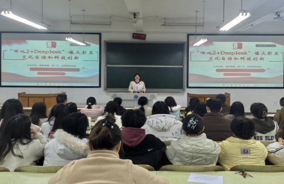 张琼燕以电影《哪吒2》为桥梁,带领同学们探索传统文化与现代科技的完美融合。课堂上,她精心选取了电影中有关机械龙宫、三星堆青铜器纹路等精彩片段,引导同学们深入思考如何让传统文化在新时代焕发新生;“以梁文锋为代表的85后年轻力量,正在破解全球人工智能产业长期依赖‘堆算力’‘大力出奇迹’的路径依赖,以深度求索不断实现技术突围”,她以 DeepSeek的崛起为切入点,为同学们展开了一幅波澜壮阔的科技发展画卷。