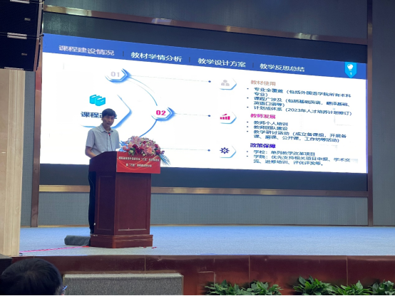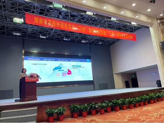 院校分享环节,湖南工商大学、湖南工程学院、湖南文理学院和湘潭大学的外语学院院长及教师团队分享了各校外语类专业在推进“三进”课程教学过程中的经验。我院王家义教授介绍了湖南工程学院外语类专业“三进”教学工作整体情况,张钲宇老师从翻译课程建设与规划、教材学情分析、教材设计方案和教学反思几个方面分享了“三进”教学翻译类课程建设的湖工经验,并得到与会教师好评。