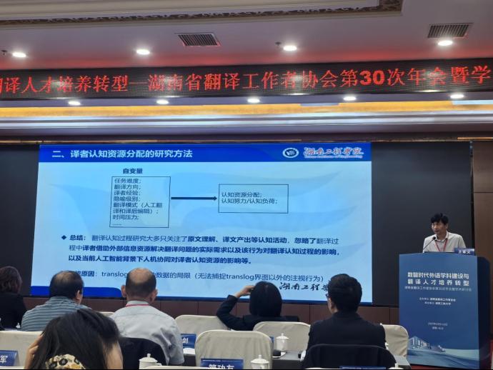 湖南工商大学副校长张玲教授致辞,她对湖南省译协及兄弟单位莅临湖南工商大学表示热烈欢迎,对省译协和兄弟单位长期以来对湖南工商大学外语学科建设发展的支持表示感谢。中国译协常务副秘书长邢玉堂译审,湖南省翻译工作者协会会长曾艳钰也先后致辞。本次大会以“数智时代外语学科建设与翻译人才培养的转型”为主题,会议设8场专题报告,设翻译理论与实践、语言学与外语教学、文学与跨文化三类4组分组平行研讨,1场3组青年英才论坛。我院王家义教授做了题为《 AI驱动下译者认知资源协同分配研究》的主题报告,内容包括为何要开展译者认知资源分配研究,采用了何种研究方法,并进行了案例分析,王家义教授的报告获得了与会者的广泛认可。